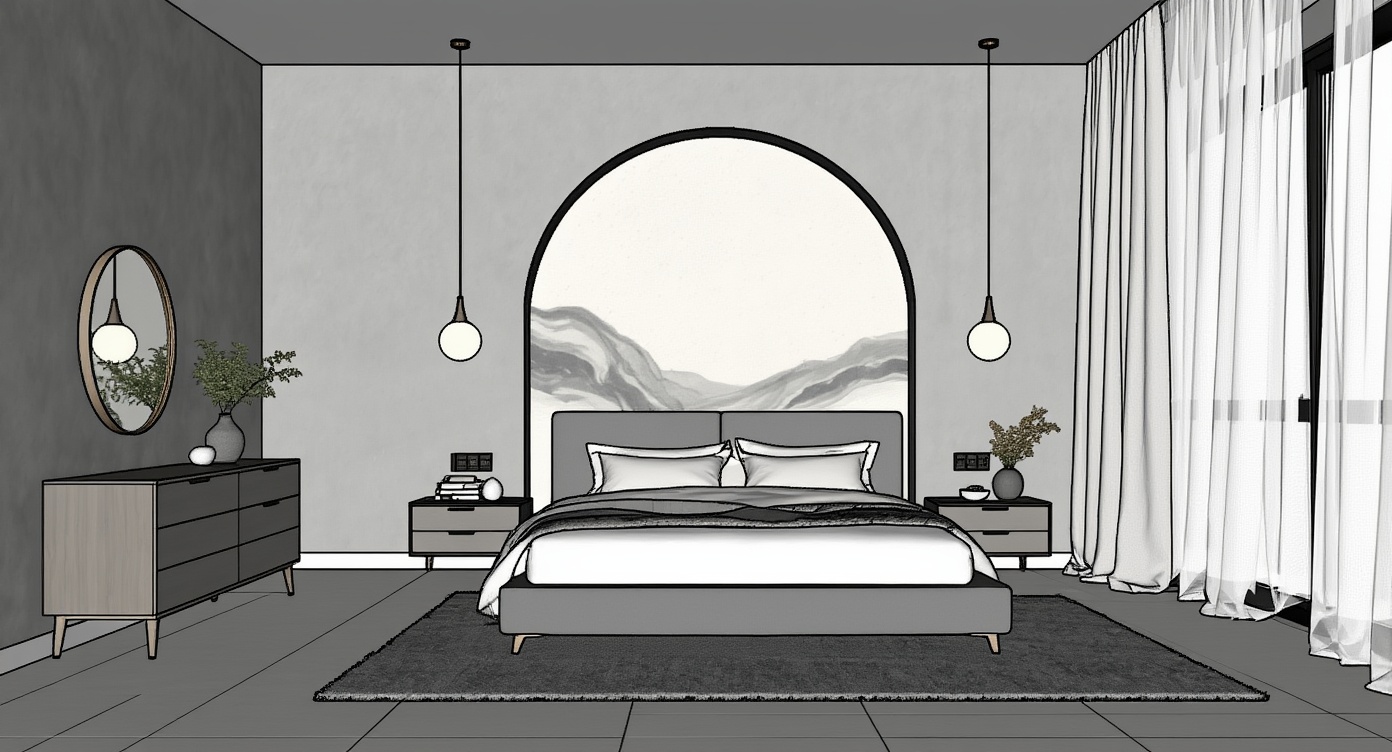 3d rendering for interior design of a modern bedroom featuring an arched feature wall, upholstered bed and soft neutral palette. this photorealistic visualization captures gentle morning daylight, refined material textures, and balanced natural shadows — creating a calm, elegant atmosphere ideal for showcasing contemporary bedroom and interior design concepts.