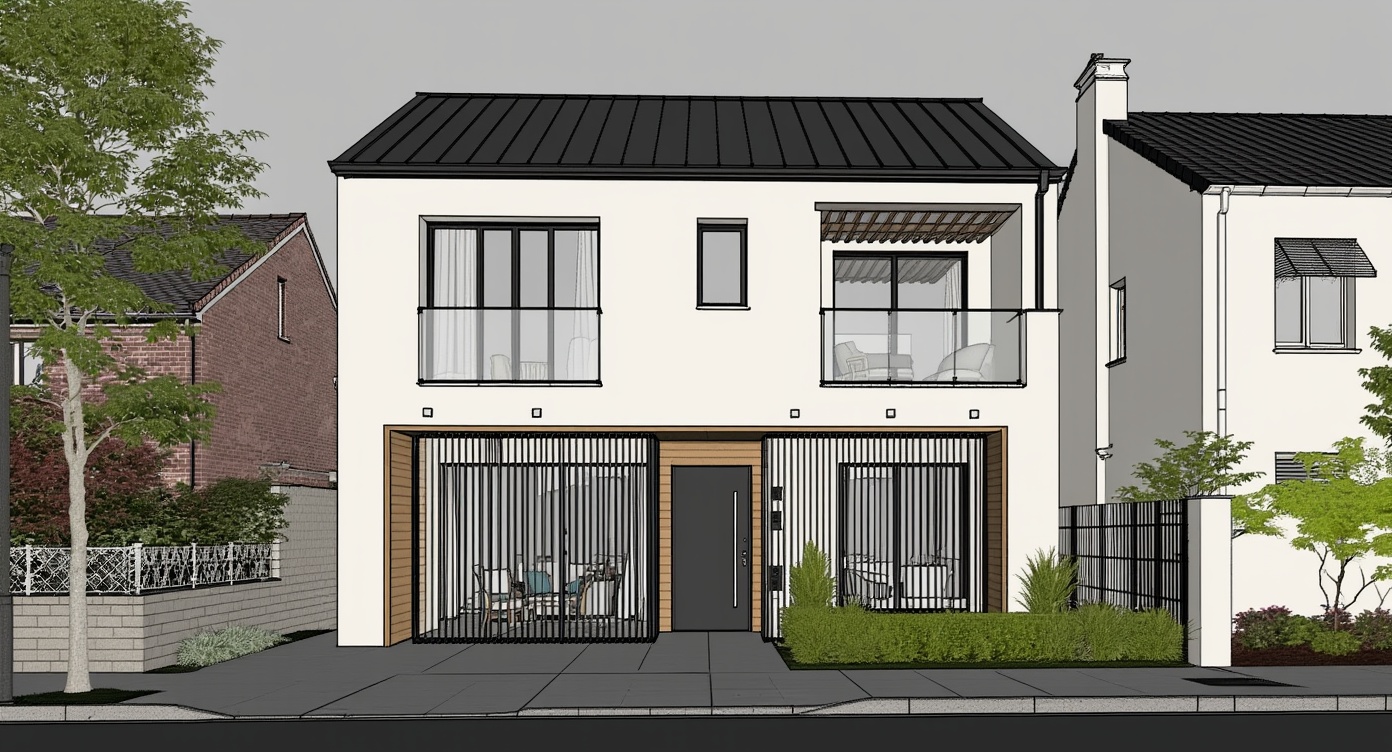 This high-resolution photorealistic 3d render presents a modern two-storey townhouse facade defined by ai house exterior design principles, featuring crisp white plaster walls, a dark metal roof, large multi-pane windows, and a recessed entrance screened by vertical black metal slats framed in warm wood. an upper balcony with a glass balustrade and wooden pergola adds architectural depth. the scene faithfully preserves the exact composition and surroundings of the original sketch — adjacent townhouses, sidewalk, street frontage, and the tree on the left — rendered in clear morning daylight with soft natural shadows and all artificial lighting left off for a clean, realistic exterior presentation.