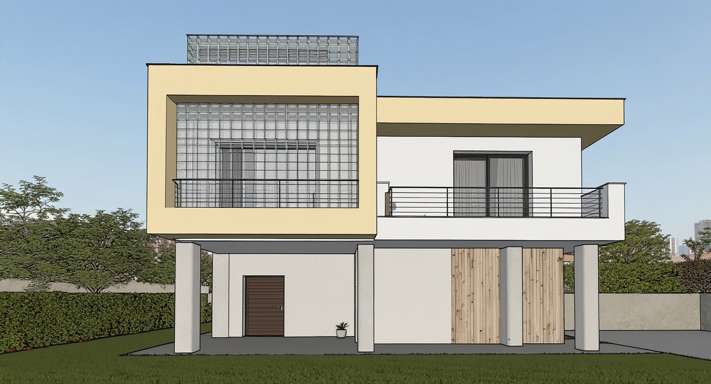 This high-resolution photorealistic modern house ai exterior design showcases an elevated two-story residence distinguished by a prominent glass-block stair tower, minimalist white and pale-yellow plaster facades, exposed textured concrete support columns, and two compact cantilevered balconies with metal-and-glass railings. rendered in clear morning sunlight with all artificial lighting turned off, the scene features warm early-morning highlights, soft directional shadows, and crisp illumination across the facades and parapet. framed sliding glass doors, narrow louvered windows, and a textured vertical wood panel at the ground-level service zone add refined detail. the house sits on a neatly trimmed green lawn with a simple concrete walkway, framed by a distant city skyline backplate under a clear blue sky. realistic materials — semi-translucent patterned glass blocks, subtly reflective glazing, matte plaster, rough cast concrete, and metal railings with natural specular highlights — combine with a straight-on eye-level composition to emphasize the building elevation, the open ground-floor parking area, and the clean architectural lines of its balconies and overhangs.