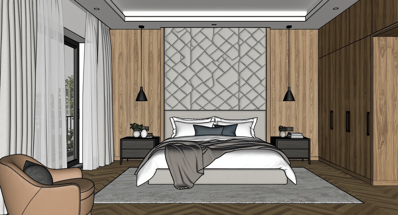 Sketchup rendering of a modern master bedroom featuring elegant wood paneling, a geometric upholstered headboard wall, and warm herringbone flooring. this photorealistic 3d visualization captures soft morning daylight, layered lighting, and refined neutral tones — creating a calm, sophisticated atmosphere ideal for interior design and architectural visualization.