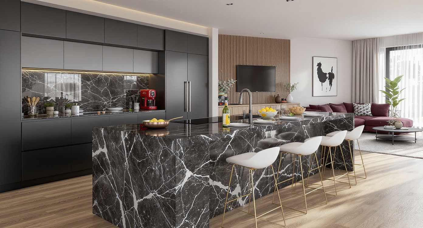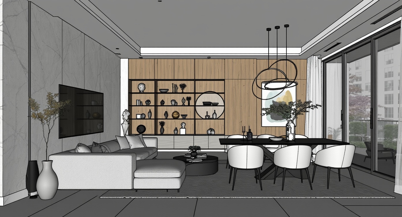 This high-resolution photorealistic 3d render of modern living room showcases an open-plan living and dining space with a large light-gray sectional facing a recessed media unit and low console on the left, while a formal black dining table with eight cream-upholstered chairs anchors the right side. decorative wall panels, built-in shelving with curated objects and a white bust, sculptural pendant lighting above the dining table, a tall arc floor lamp beside the sofa, and a large circular framed artwork on the right wall are all retained. soft morning daylight fills the room through right-side sliding glass doors, complemented by layered interior lighting including warm ambient ceiling fixtures, subtle cove lighting around the ceiling perimeter, and focused spotlights that highlight artwork and shelving. large-format warm-gray matte porcelain tiles ground the space, paired with warm wood panel accents on the back wall and cabinetry, and refined metallic finishes throughout. realistic materials, gentle shadows, balanced exposure, visible tile grout lines, textured upholstery, natural wood grain, and soft reflective highlights create a polished, welcoming atmosphere with an urban high-rise exterior backplate visible through the glazing.
