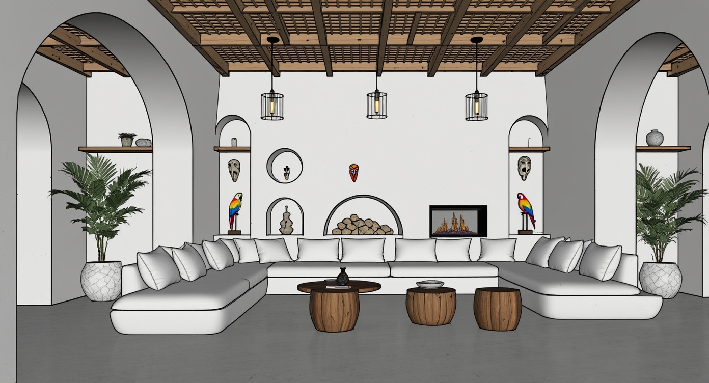 Ai rendering of a modern coastal lounge featuring built-in white seating, mediterranean-inspired textures, and warm wood accents. this photorealistic visualization captures soft morning ambient daylight, realistic concrete floor reflections, sculptural niche décor, and natural materials — creating a calm, airy coastal atmosphere ideal for interior design and architectural presentation.