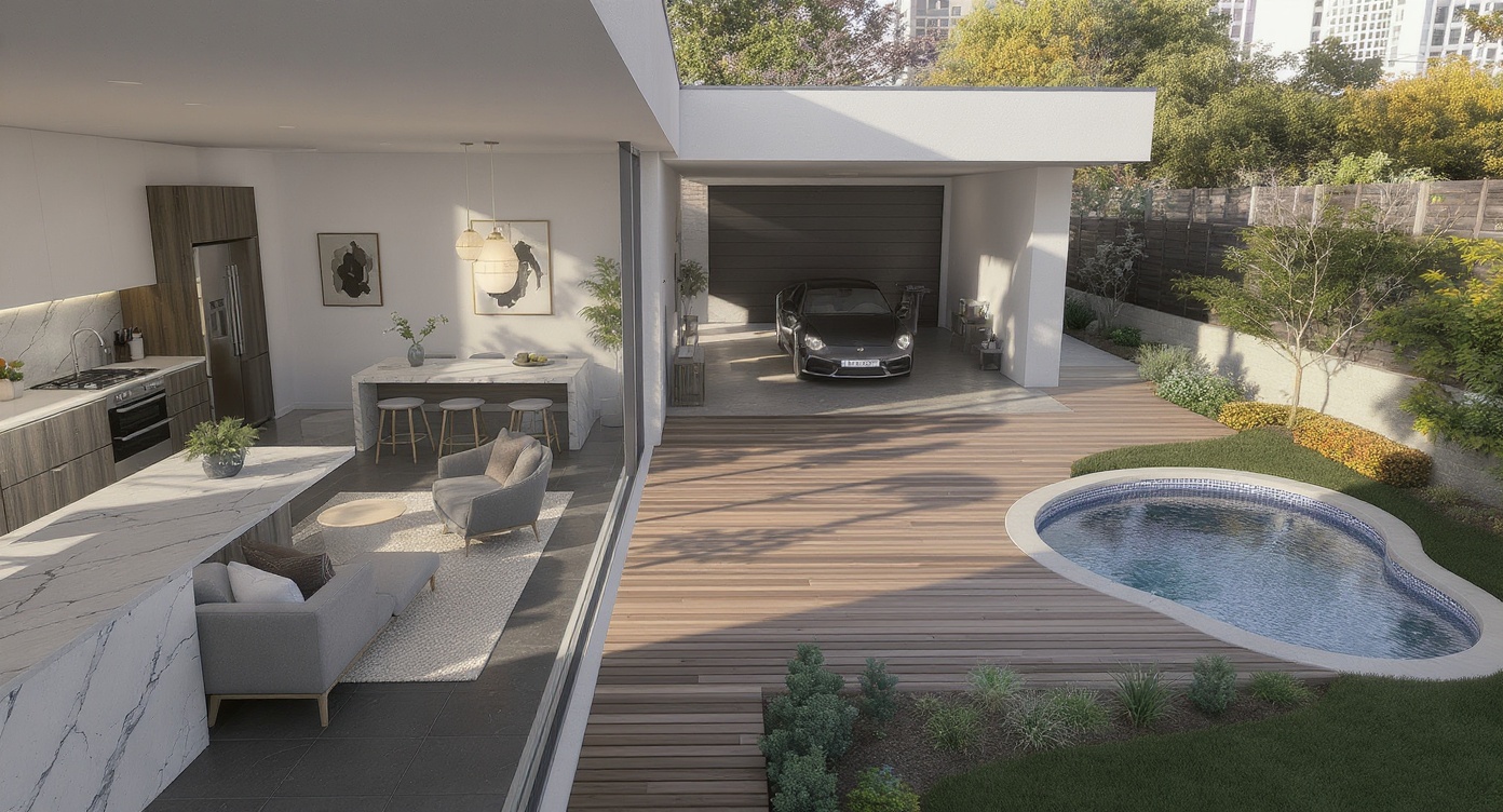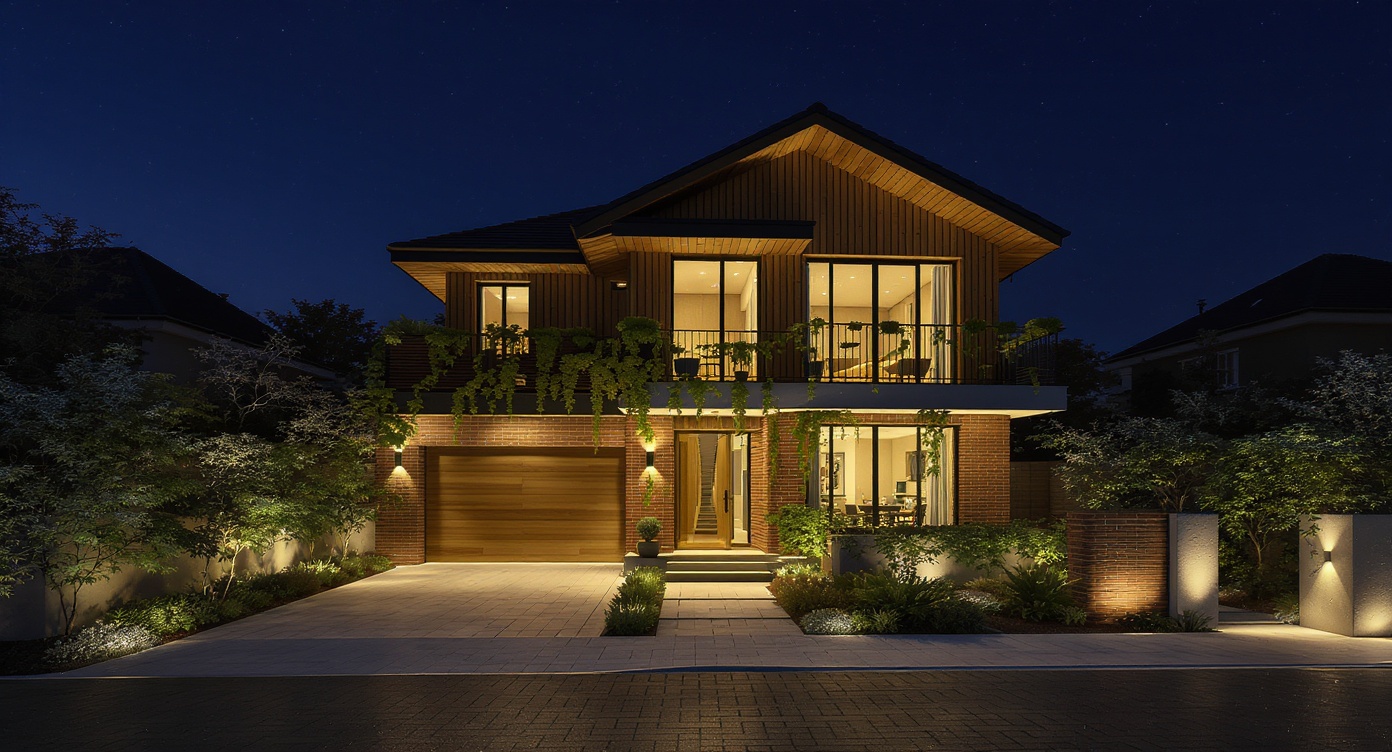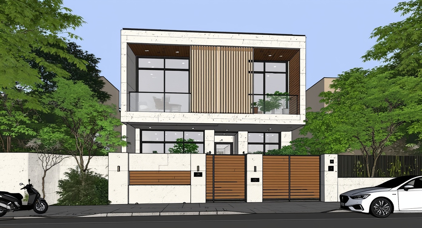Sketchup to 3d render of a contemporary urban townhouse facade featuring clean modern lines, textured concrete and vertical wood paneling. using photorealistic 3d rendering techniques architecture, this visualization captures the warm glow of evening lighting, realistic reflections on wet pavement, and balanced contrast between illuminated interiors and cool city tones — creating a cinematic, high-detail presentation ideal for modern architectural visualization.