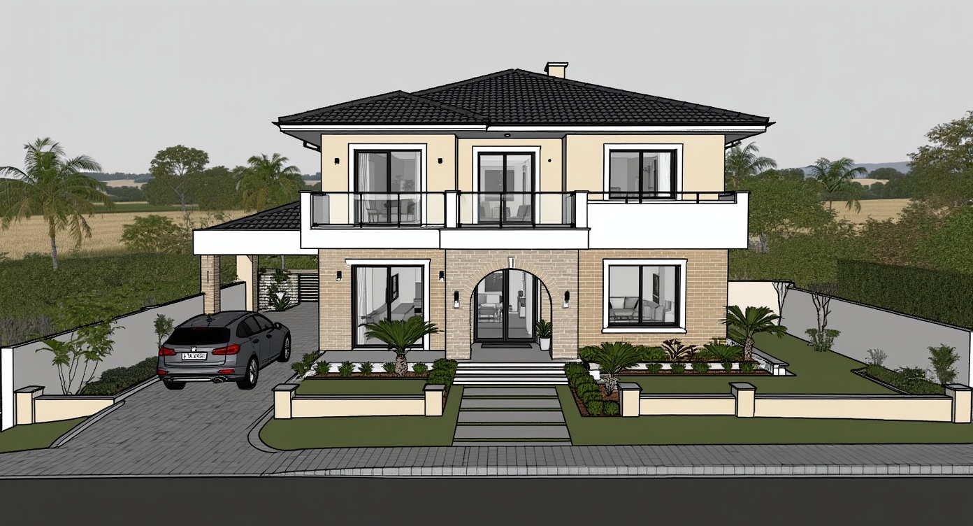 This high-resolution photorealistic elevation design for house presents a modern two-story exterior with a warm-beige façade, subtle brick accents, a raised front porch framed by a decorative arch, large ground-floor glass doors, and a balcony above. the paved driveway features a parked hatchback, while low boundary walls enclose a symmetrical landscaped front yard with palm shrubs, a central paved walkway to the porch steps, garden beds along the sides, and a small outdoor seating nook to the right. rendered in soft morning overcast lighting with diffuse natural daylight and all artificial fixtures turned off, the scene highlights textured paving, trimmed lawn, and realistic materials. a countryside backplate with gentle rolling fields and trees appears beyond the property, captured from an elevated, slightly front-facing camera angle that clearly frames the house, balcony, yard layout, and driveway.