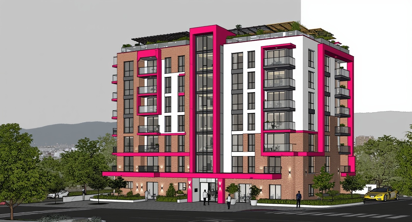 This high-resolution photorealistic apartment design render showcases a modern mid-rise exterior with bold magenta accents, alternating brick and white plaster facades, horizontal dark-gray bands, a vertical glazed stair/elevator core, recessed balconies with black railings, and a rooftop terrace with pergola and planters. the evening scene features warm low-angle sunlight casting long soft shadows while all artificial lighting — entrance pendants, balcony sconces, and rooftop lamps — emits a welcoming glow. street-level details include a tiled entry ramp, two people near the doorway, a yellow sports car at the curb, and landscaped green beds, set against a softly blurred mid-density cityscape with subtle ambient city glow. realistic materials such as textured brick, smooth plaster, glossy glazing, metal railings, and vibrant magenta trim are rendered with accurate reflections, natural shadowing, and balanced exposure to harmonize warm artificial light with fading daylight.