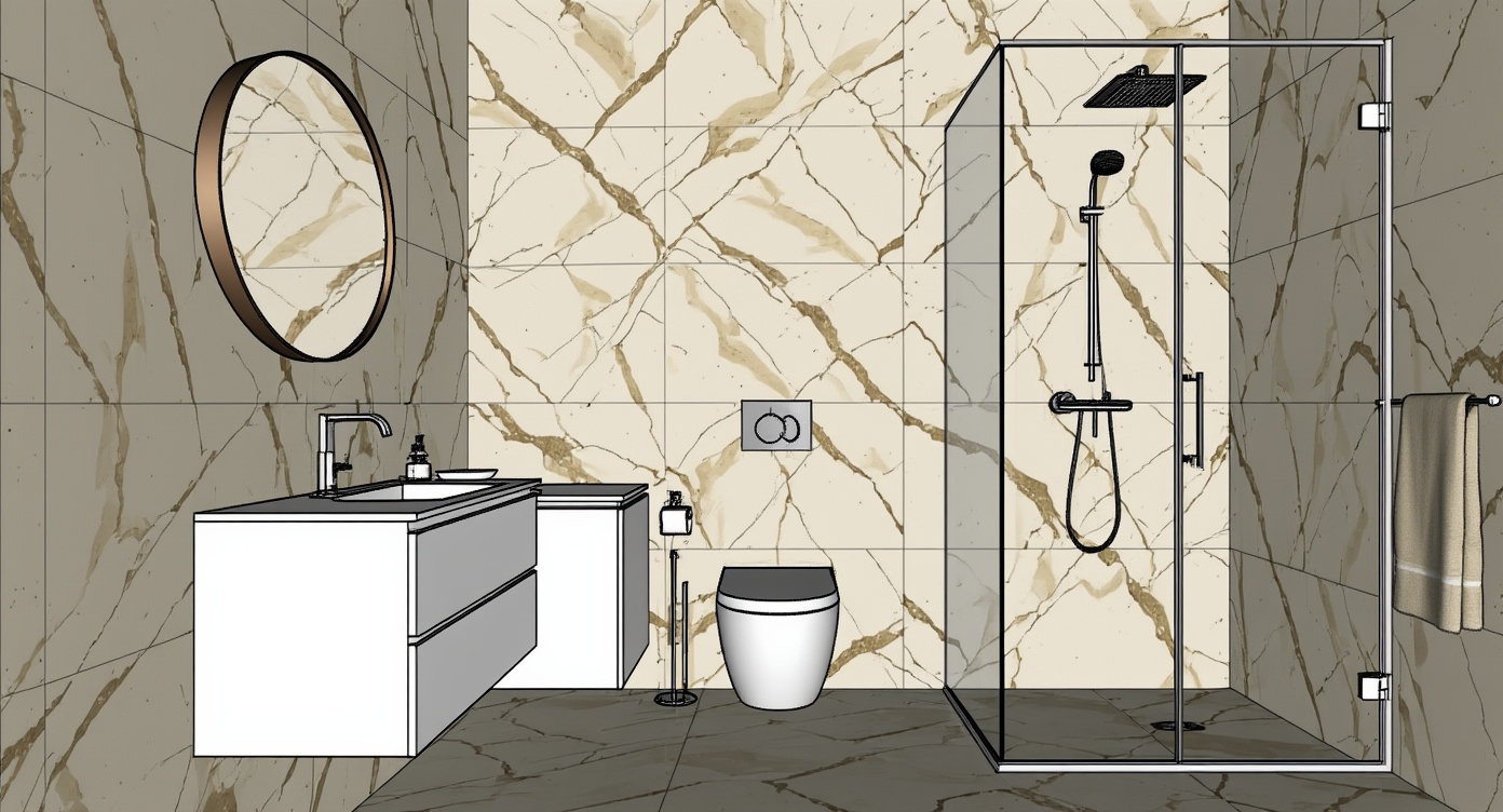 3d photorealistic rendering of sketchup model of a modern bathroom interior featuring light-beige polished marble walls and flooring, a minimalist vanity with a round mirror, and a sleek open walk-in shower. this high-quality photorealistic 3d visualization captures warm evening lighting, realistic reflections, and refined material detailing — creating an elegant, contemporary atmosphere ideal for architectural and interior design presentation.