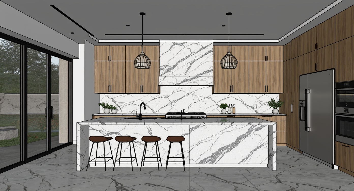 Sketchup render of a modern luxury kitchen featuring a marble-clad central island, warm wood-paneled cabinetry and elegant evening lighting. this photorealistic 3d visualization highlights refined material textures, soft ambient illumination, and realistic reflections — creating a sophisticated, high-end atmosphere ideal for interior design and architectural presentation.