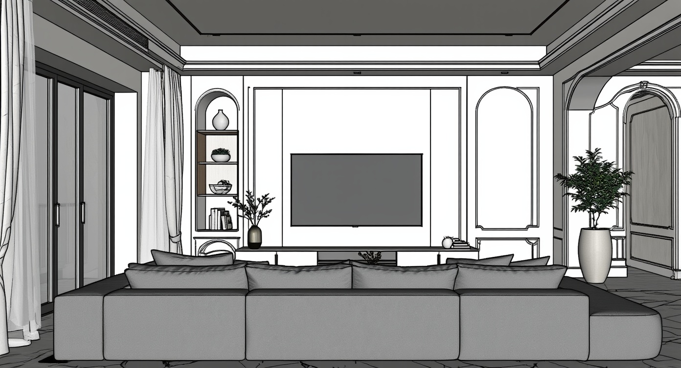 This high-resolution photorealistic render showcases ai interior design in a modern living room featuring polished marble flooring, layered ceiling lighting, and a refined feature tv wall. soft morning daylight fills the space and is gently complemented by ambient, cove, and profile lighting. a large grey velvet sectional with textured cushions anchors the foreground, paired with a low console holding a simple vase of dried branches. the cream-colored paneled tv wall includes a recessed flat-screen framed by slim dark reveal lines, with integrated shelving on the left displaying curated objects and subtle curved panel details on the right. matte neutral walls with refined molding, warm brushed metal accents, and realistic reflections across the marble floor contribute to a serene, elegant morning atmosphere.