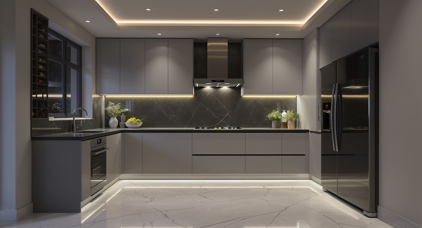 This high-resolution photorealistic modern kitchen ai rendering depicts a compact l-shaped layout with flat-panel matte light-grey cabinetry, a dark honed stone countertop, a continuous textured dark backsplash, and polished pale marble flooring. shown at night, the scene features layered artificial lighting — warm cove illumination, soft ambient ceiling light, under-cabinet task lighting, targeted track lights over the cooktop and sink, and subtle spot highlights on stainless appliances — creating realistic reflections, gentle shadows, and a clean, modern atmosphere while keeping the entire kitchen sharply readable.