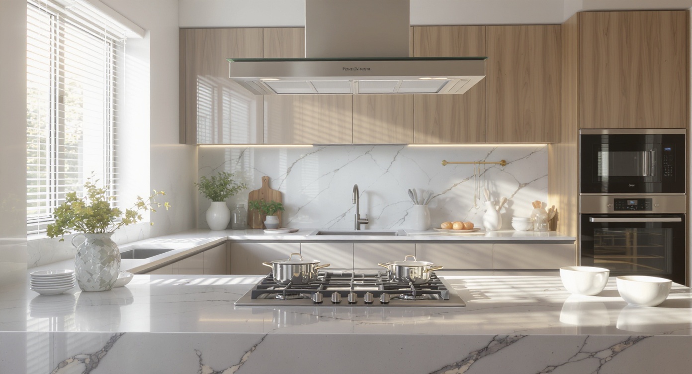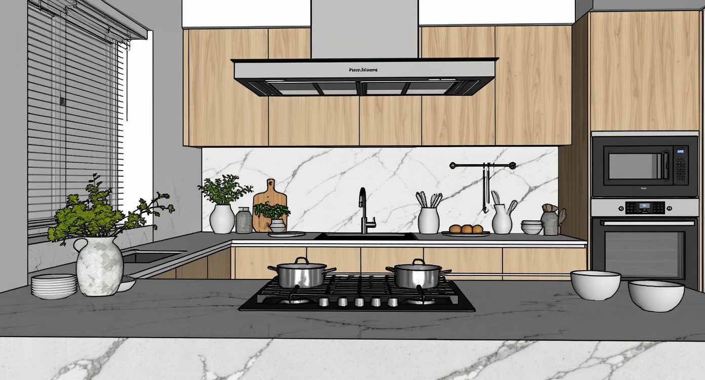 Sketchup render of a modern luxury kitchen featuring a marble-clad central island, warm wood-paneled cabinetry and elegant evening lighting. this photorealistic 3d visualization highlights refined material textures, soft ambient illumination, and realistic reflections — creating a sophisticated, high-end atmosphere ideal for interior design and architectural presentation.