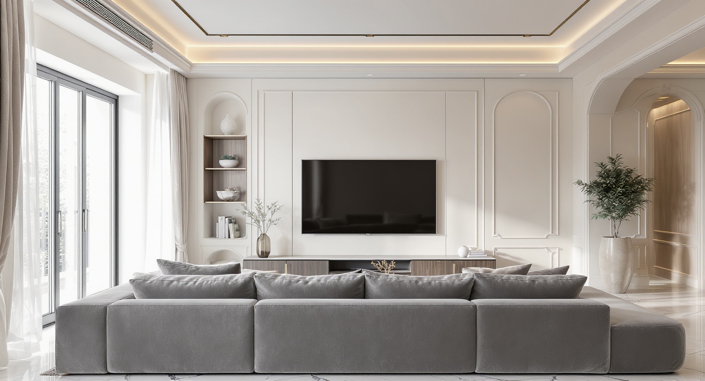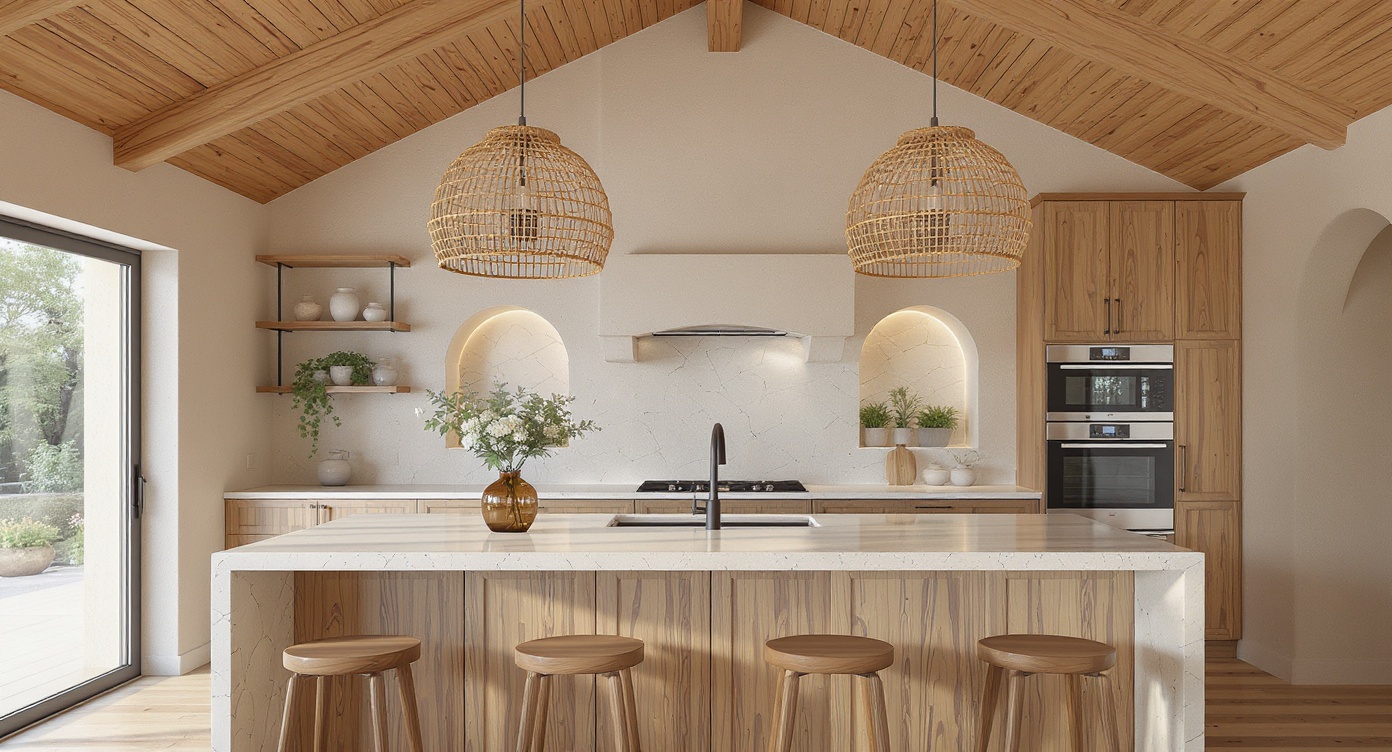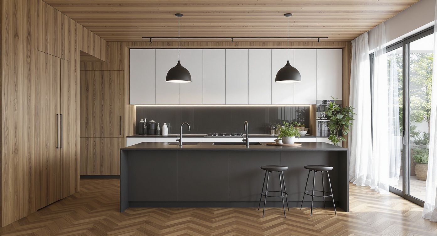 This high-resolution 3d design interior rendering showcases a modern kitchen with rich wood paneling and a long dark matte island featuring an integrated sink and two black bar stools. minimalist black pendant lights hang from visible cords above the island, while tall white flat-panel cabinetry lines the back wall and a seamless wood-paneled wall with a concealed door anchors the left side. morning daylight filters softly through sheer curtains on the large sliding glass doors to the right, complemented by gentle ambient ceiling lighting and focused spotlights that highlight the island and cabinetry. warm herringbone wood flooring grounds the space, accented by a small potted plant on the island and a taller plant near the doors, creating a refined, natural, photorealistic atmosphere.