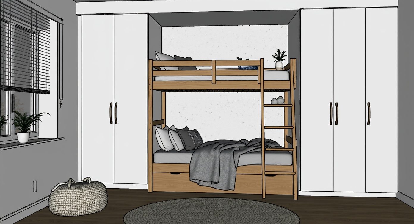 Sketchup render of a minimalist modern bunk bedroom featuring built-in storage, light oak wood finishes, and clean contemporary design. this photorealistic 3d visualization showcases soft morning daylight, realistic textures, and warm neutral tones — creating a calm, airy atmosphere ideal for compact interior and architectural design presentations.