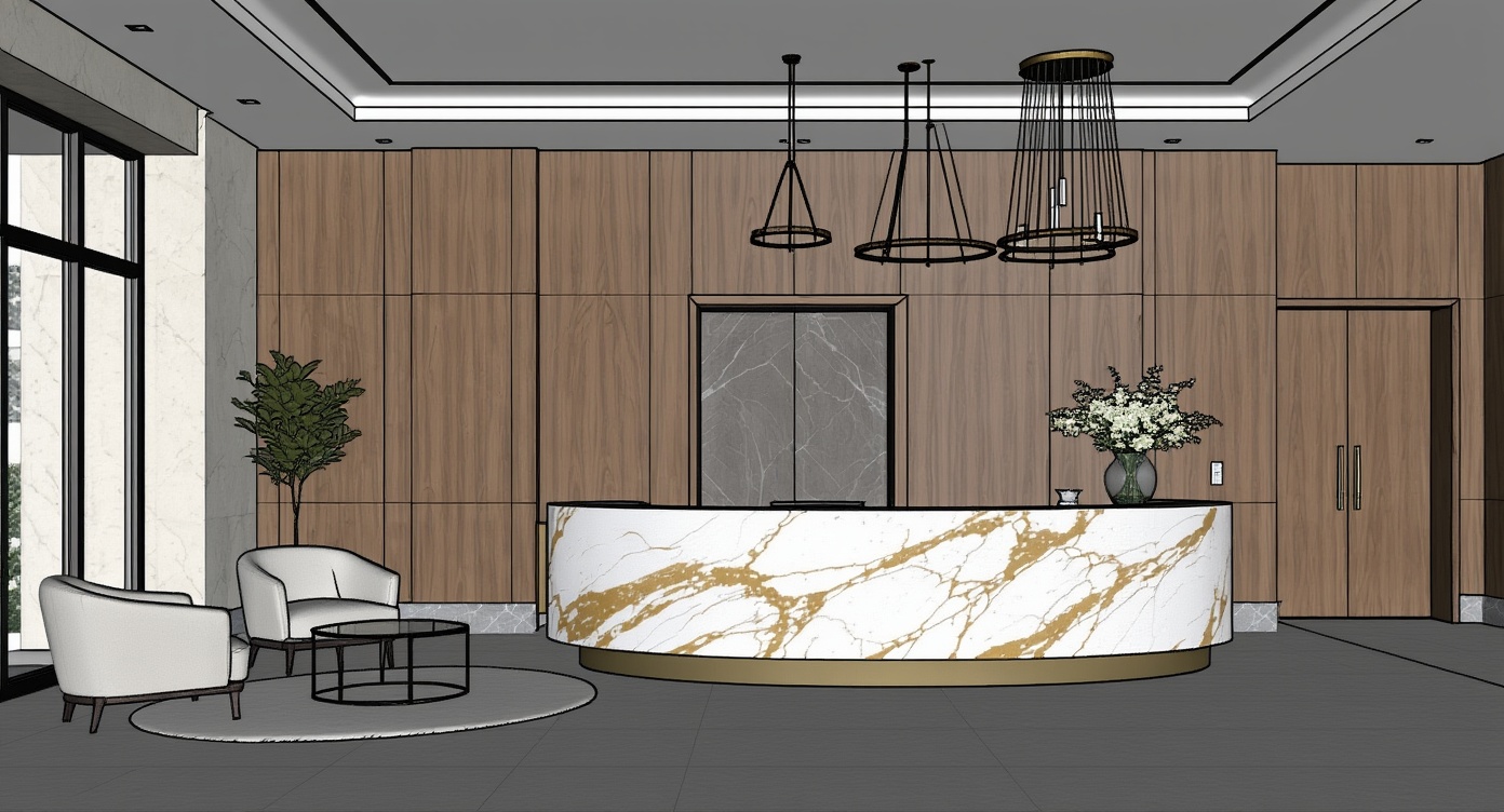 This high-resolution photorealistic interior design of hotel lobby render showcases a modern space featuring a curved polished white-and-gold-veined marble reception desk set against a dark wood-paneled elevator core with a recessed doorway and marble-clad surround, a cozy seating nook with two light beige upholstered lounge chairs on a patterned round rug beside a small glass-top table, a solid wooden entry door to the right, and elegant circular pendant lights suspended above. morning daylight softly illuminates the lobby, creating gentle natural shadows across the large-format dark grey tile flooring with subtle grout lines and soft reflections, while marble veining, warm wood grain, and tactile fabrics appear with realistic depth. a clear glass vase with fresh flowers sits atop the reception counter, complemented by accurate ambient occlusion and carefully maintained scale for a clean, refined, photorealistic finish.