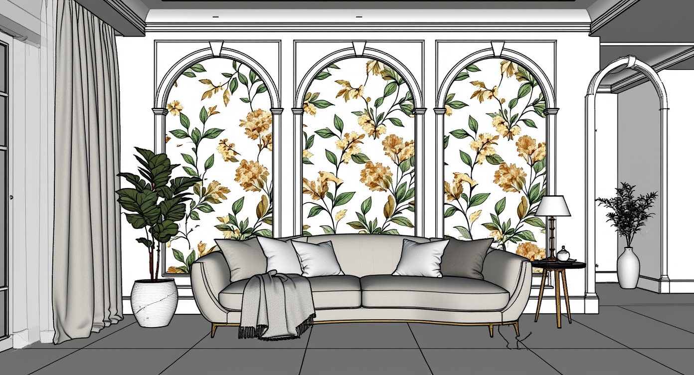 This high-resolution photorealistic living room design showcases a modern, serene space centered around a curved sofa and three elegant arched wall panels featuring a soft, muted floral mural. the room is styled in a calm neutral palette with patterned decorative cushions, a potted fiddle leaf fig to the left of the sofa, and full-length textured curtains along the left wall. the original flooring is replaced with glossy polished marble featuring subtle grey veining, capturing gentle reflections from soft morning daylight. lighting combines bright natural daylight with warm ceiling cove illumination and balanced ambient fill to avoid harsh shadows while enhancing the softness of fabrics, painted arch trims, and ceramic planter surfaces. the adjacent hallway on the right remains bright to convey depth and daylight continuity, and the composition is framed at eye level, slightly centered on the sofa and arched panels, emphasizing the calming mural and refined, elegant mood.