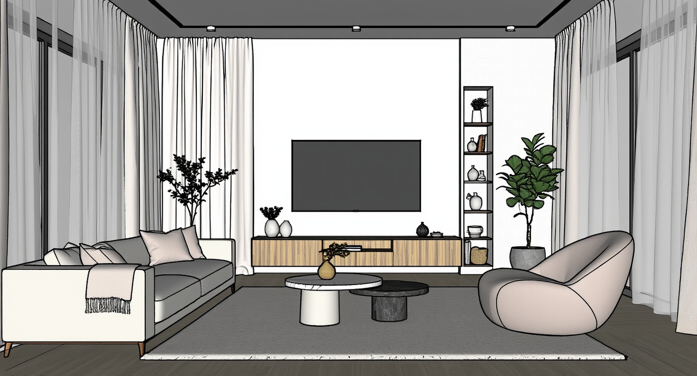 3d visualization of a modern living room interior with soft contemporary styling, natural wood flooring, and warm morning daylight filtering through sheer curtains. this photorealistic render highlights refined furniture, blush-toned accents, and realistic materials like marble, wood, and textured fabrics — creating a bright, airy atmosphere ideal for interior design and architectural visualization.