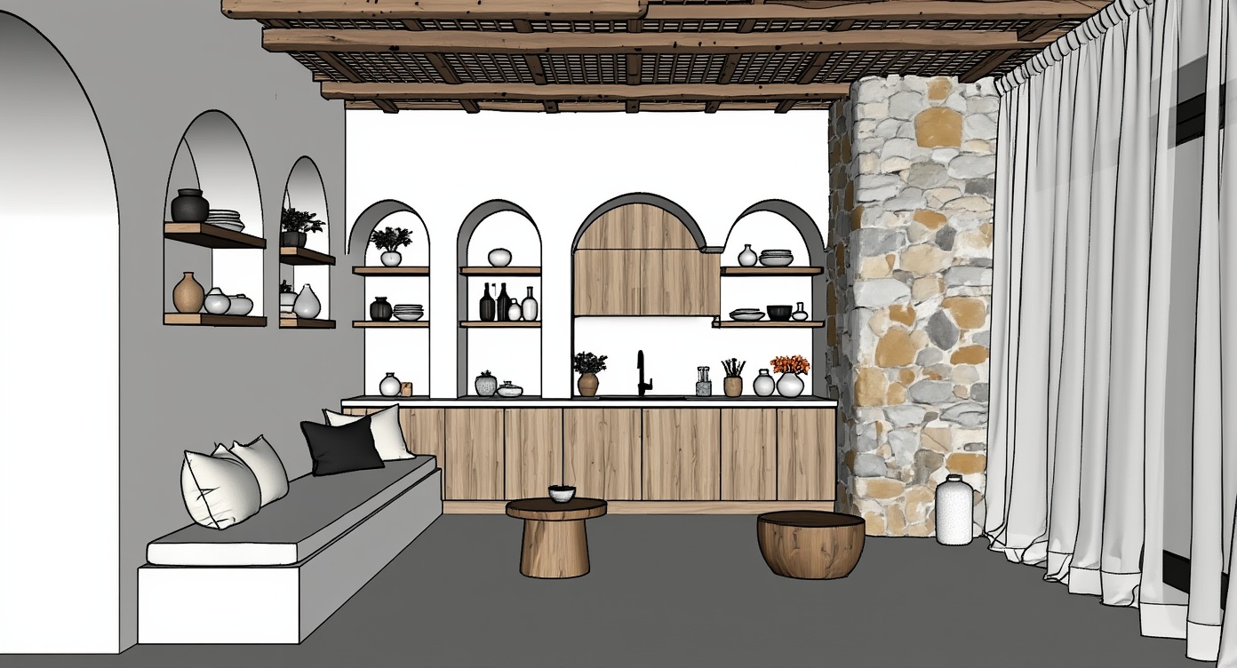 Photorealistic 3d render of a modern mediterranean-inspired living/kitchen niche featuring textured white plaster walls, built-in bench seating, arched niches, and a warm wood-lattice ceiling. this visualization captures soft morning daylight filtering through sheer curtains, subtle interior accent lighting, and tactile materials — including poured concrete flooring, warm wood shelving and cabinetry, and a natural stone feature column — creating a serene, airy atmosphere ideal for refined interior design presentations.