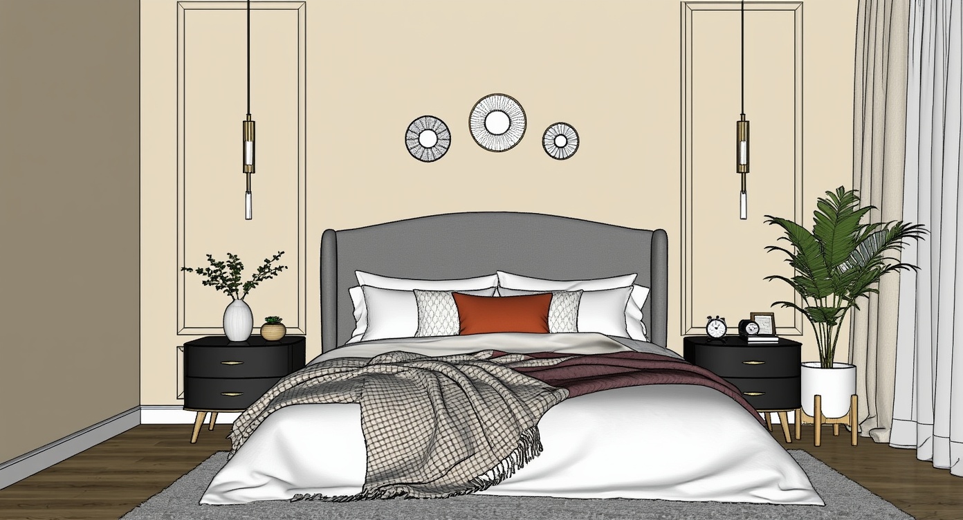 This high-resolution photorealistic bedroom render showcases ai interior design with soft curved wall detailing framing a textured grey upholstered headboard, sleek lacquer bedside tables, and natural medium-tone wood plank flooring. warm morning daylight filters gently through sheer curtains, complemented by warm ceiling cove lighting and soft ambient fill to create a bright yet cozy atmosphere. the bed features layered neutral textiles — a linen duvet, patterned wool throw, mixed pillows, and a central rust accent cushion — while three round decorative wall artworks above the headboard and a contemporary vertical pendant light on the left enhance the modern aesthetic. on the right bedside table, a small clock, a vase with delicate branches, and a nearby potted plant in a white ceramic pot on a wooden stand add subtle styling. realistic materials are emphasized through matte painted walls, defined curved trim shadows, textured fabric upholstery, glossy bedside table tops, and gentle wood-floor reflections, resulting in a calm and refined photorealistic composition.