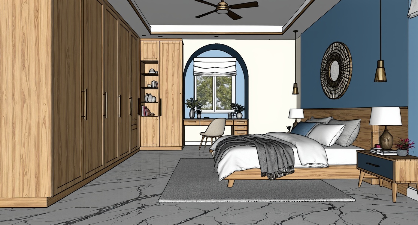 This high-resolution photorealistic interior design for a bedroom features a modern space with warm wood furniture and newly installed polished marble flooring with subtle grey veining that complements the neutral walls and blue accent alcove. the composition includes a wooden platform bed with layered bedding and a patterned throw, a built-in wood wardrobe, a desk alcove with shelving and a blue back panel, and decorative round wall art above the headboard. rendered at noon, strong natural daylight fills the room, enhanced by soft ambient illumination, warm cove lighting in the recessed ceiling tray, and targeted spotlights accenting the wardrobe and desk area. the ceiling fan, bedside pendant lights, and desk lamp all contribute to the layered lighting scheme. realistic materials, crisp wood grain, detailed fabrics, gentle shadows, and accurate reflections on the polished marble floor create a refined, photorealistic modern bedroom atmosphere.