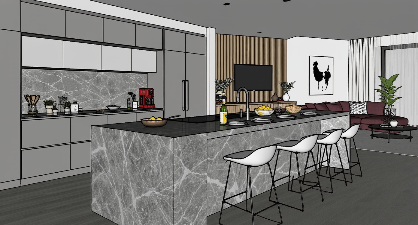 High resolution photorealistic 3d render of a modern open-plan kitchen and living area with marble island and wood flooring. the island includes an integrated black sink and induction cooktop, a copper pan, a green wine bottle, a glass bowl of lemons, neatly aligned gold-framed bar stools with white cushions and place settings, a red single-serve coffee machine, a colorful capsule carousel, and detailed water fixtures. in the background, the living area features a deep burgundy sectional, a patterned accent pillow, a low black coffee table, abstract black-and-white wall art, and a wall-mounted tv framed by vertical wood slats, with a workstation nook and monitor visible beyond. bright morning daylight, warm cove lighting, and soft ambient fills create natural shadows and realistic reflections across the marble, wood, and metal surfaces, while subtle imperfections and specular highlights add to the photorealism. a comfortable wide-angle composition captures both zones seamlessly in one cohesive scene.