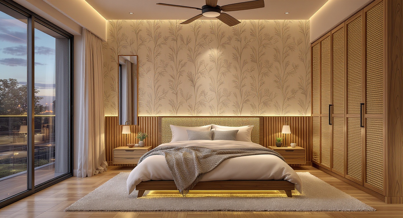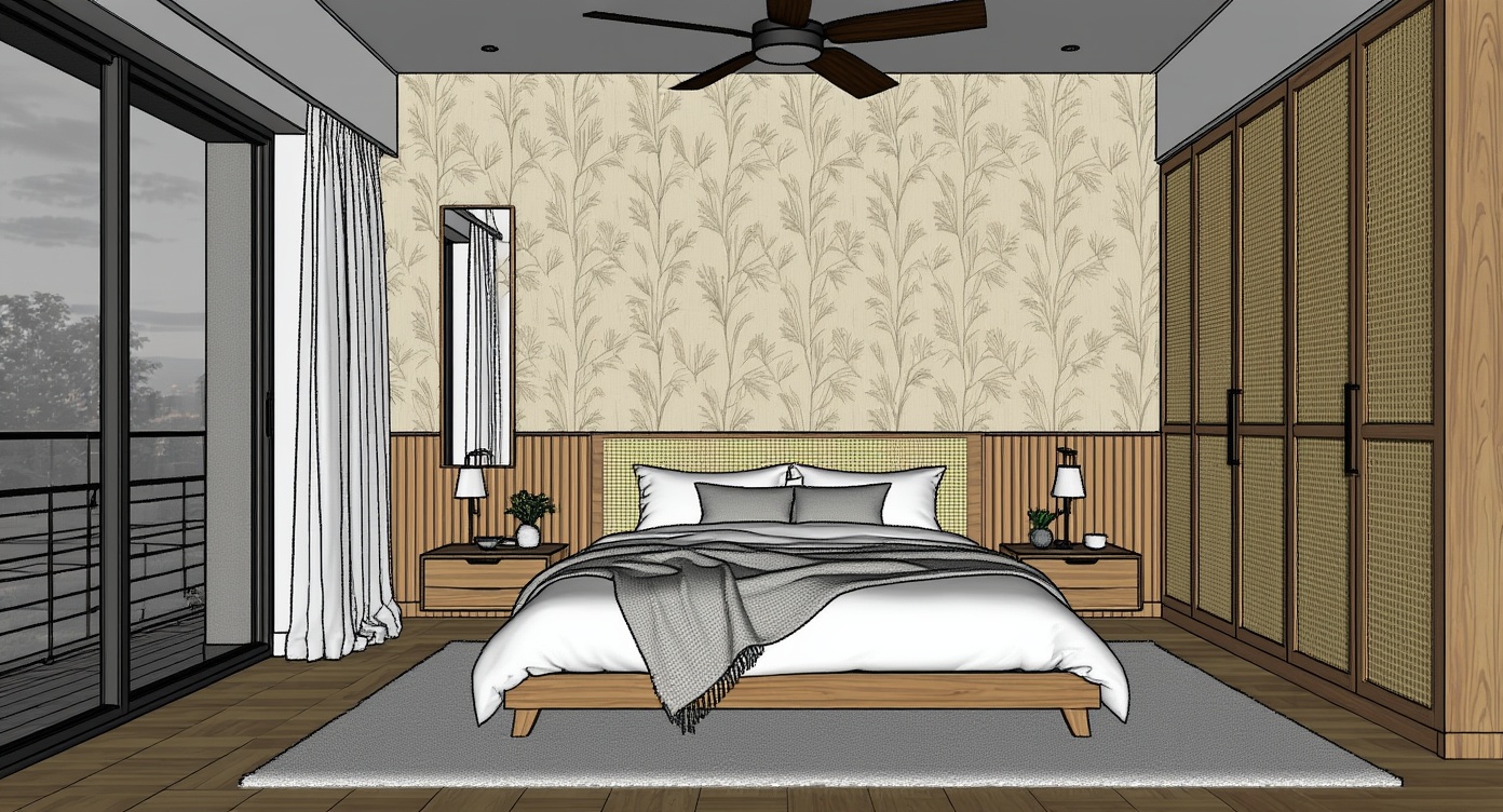 This high-resolution photorealistic 3d render showcases a contemporary bedroom with warm wood accents, centered around a bed placed against a subtle forest-motif wallpapered accent wall, a woven rattan-topped headboard, and vertical wood-slat lower paneling. designed with the refinement typical of ai interior design of bedroom concepts, the space includes floating wooden bedside benches, a tall rectangular mirror to the left, a narrow vertical window to the right, and a large built-in wardrobe with cane-panel doors.