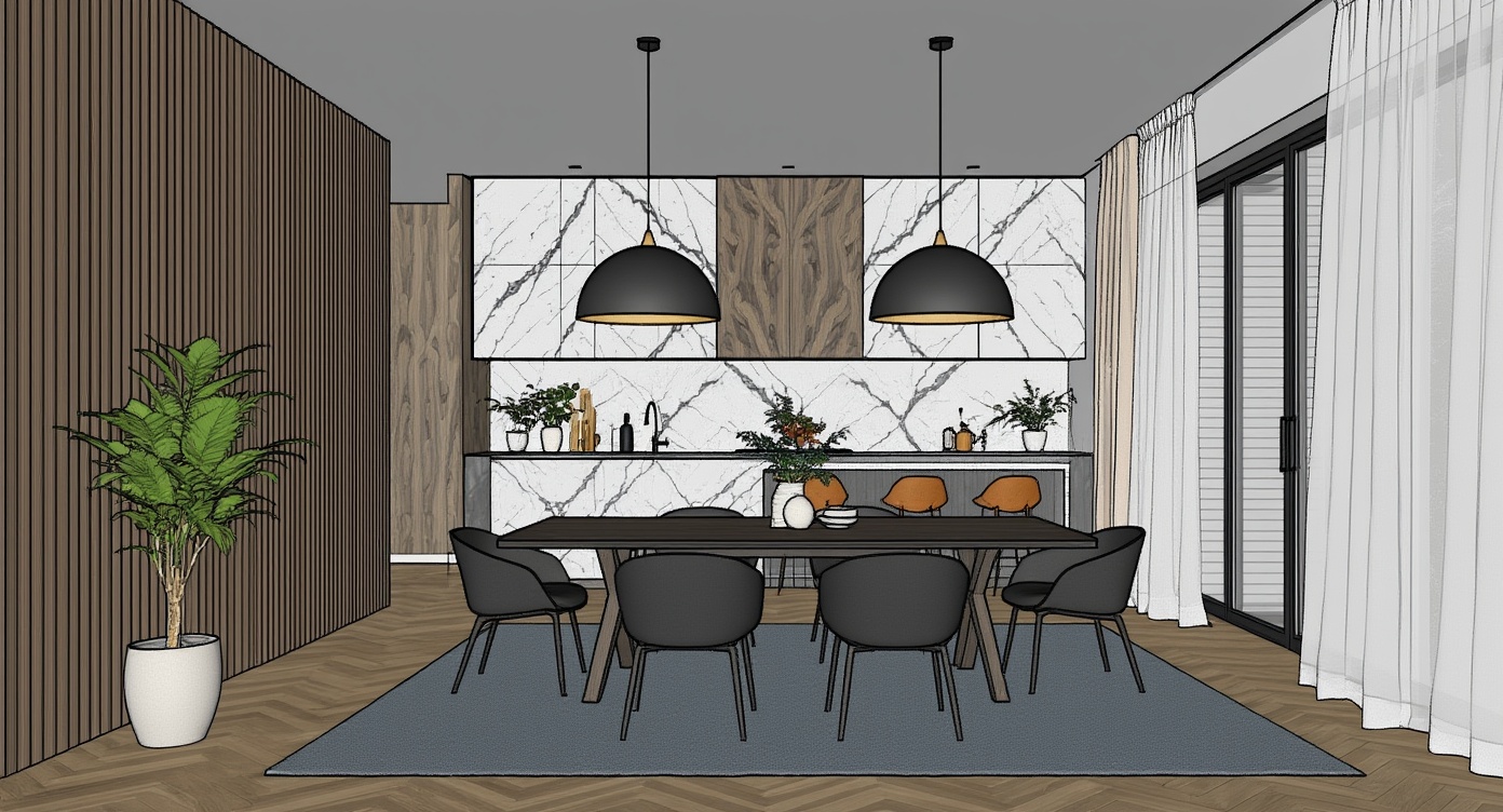 A high resolution photorealistic 3d render of a modern dining room with open-plan kitchen, dark wood accents, marble island, and large windows