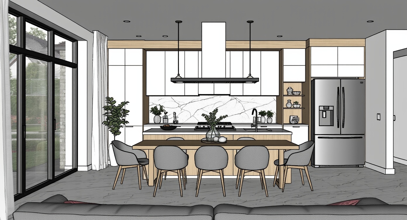 3d interior rendering of a modern open-plan kitchen and dining area featuring minimalist white cabinetry, warm wood accents, and polished marble flooring. this photorealistic visualization highlights soft morning daylight, refined material textures, and balanced natural illumination — creating a serene, contemporary residential atmosphere ideal for interior design and architectural visualization.