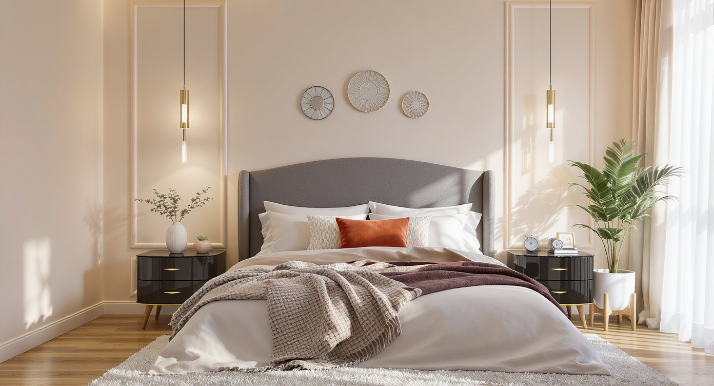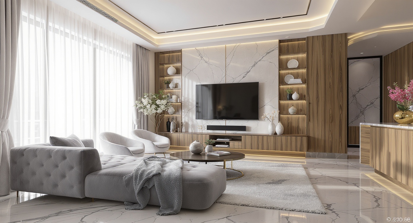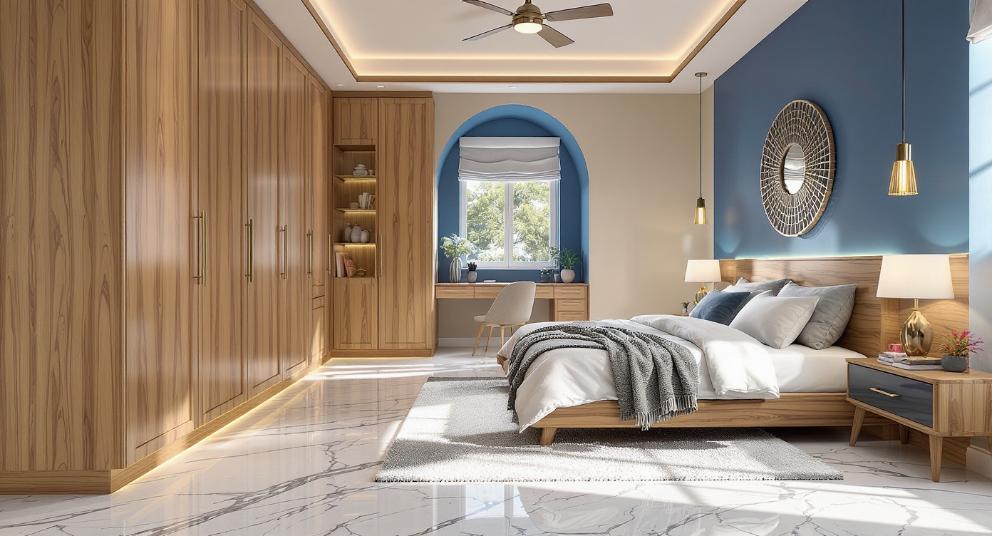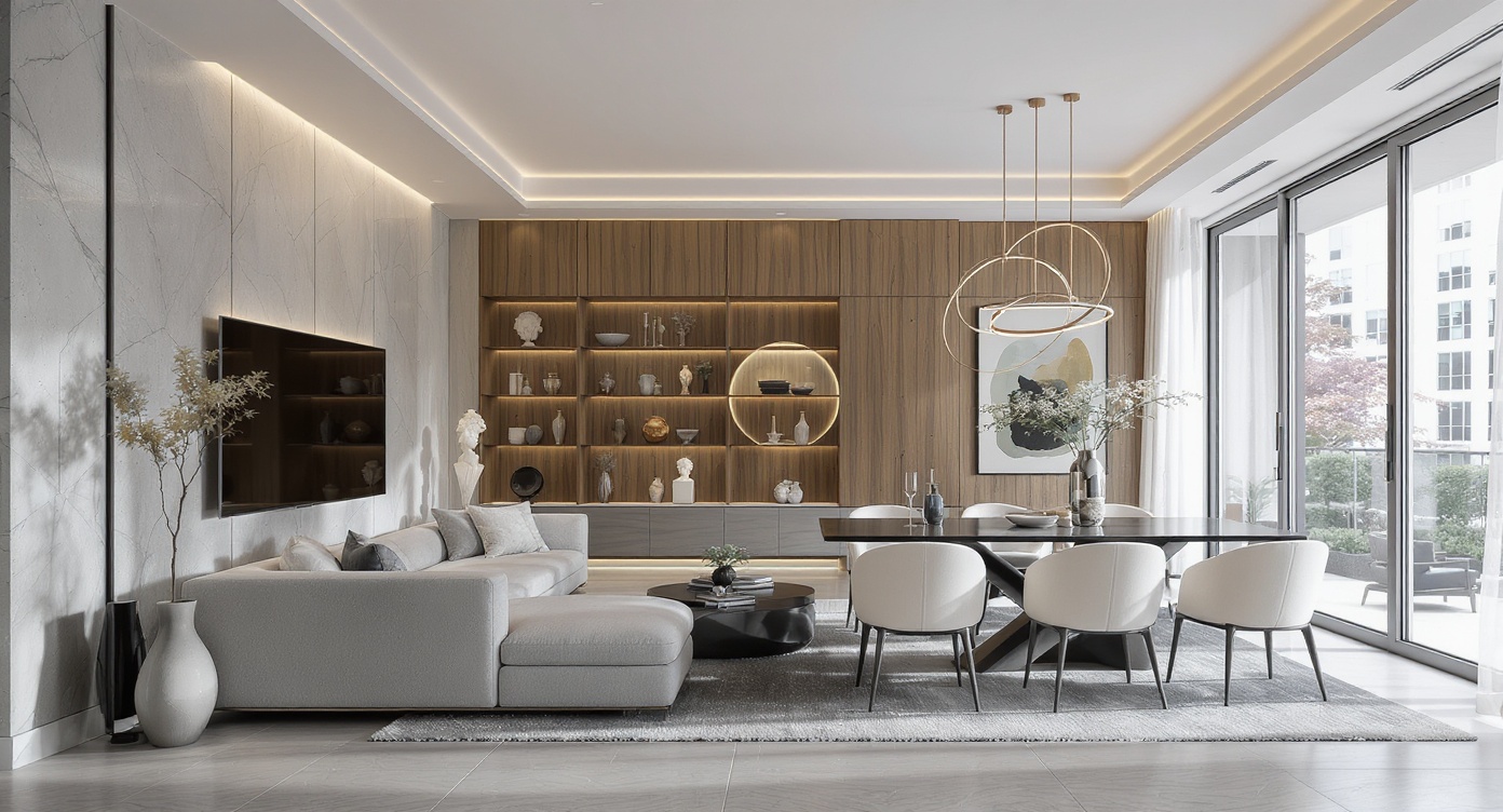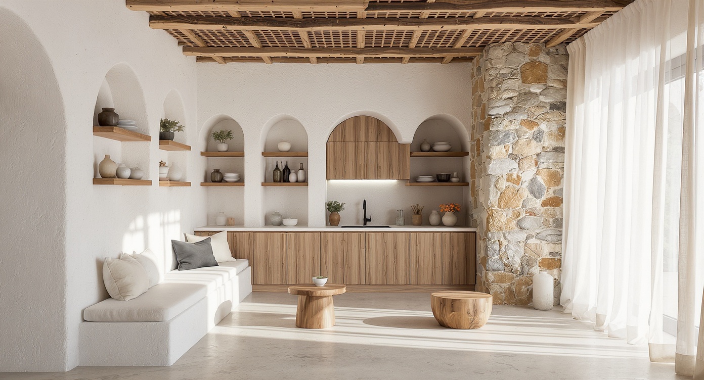 This high-resolution photorealistic interior design for restaurants depicts a modern casual dining space with round tables, clustered seating, and a long built-in bench along the left wall. a bold geometric modular shelving wall at the back features alternating cubbies in muted red, olive green, soft blue, and ochre, adding vibrant visual rhythm. the left wall includes circular porthole windows and brass sconces, while full-height glazing on the right reveals an abstract mural outside. morning daylight softly fills the room, casting gentle shadows across textured concrete flooring and reflecting off brass candle holders, glassware, and greenish stone tabletops. a warm wood plank ceiling grounds the space, while deep berry upholstered chairs and neutral bench cushions add tactile realism. soft reflections, natural light bounce, and accurate shadowing create a comfortable, inviting, photorealistic restaurant interior.