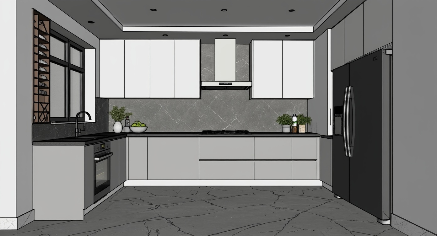 This high-resolution photorealistic modern kitchen ai rendering depicts a compact l-shaped layout with flat-panel matte light-grey cabinetry, a dark honed stone countertop, a continuous textured dark backsplash, and polished pale marble flooring. shown at night, the scene features layered artificial lighting — warm cove illumination, soft ambient ceiling light, under-cabinet task lighting, targeted track lights over the cooktop and sink, and subtle spot highlights on stainless appliances — creating realistic reflections, gentle shadows, and a clean, modern atmosphere while keeping the entire kitchen sharply readable.