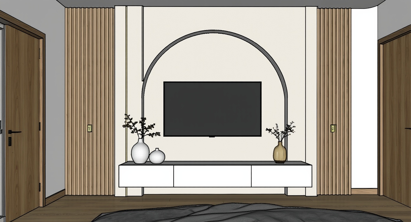 3d render ai design of a modern bedroom featuring a sculptural textured tv wall with vertical wood slats, gold insets, and a floating white console. this photorealistic visualization captures balanced noon daylight with layered ambient and accent lighting, realistic material details and soft natural shadows — creating a refined, contemporary atmosphere ideal for interior design and architectural presentation.