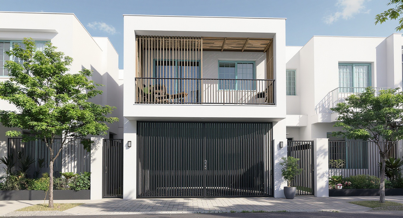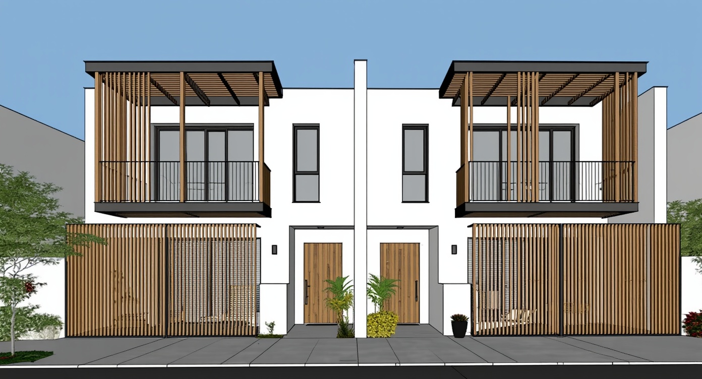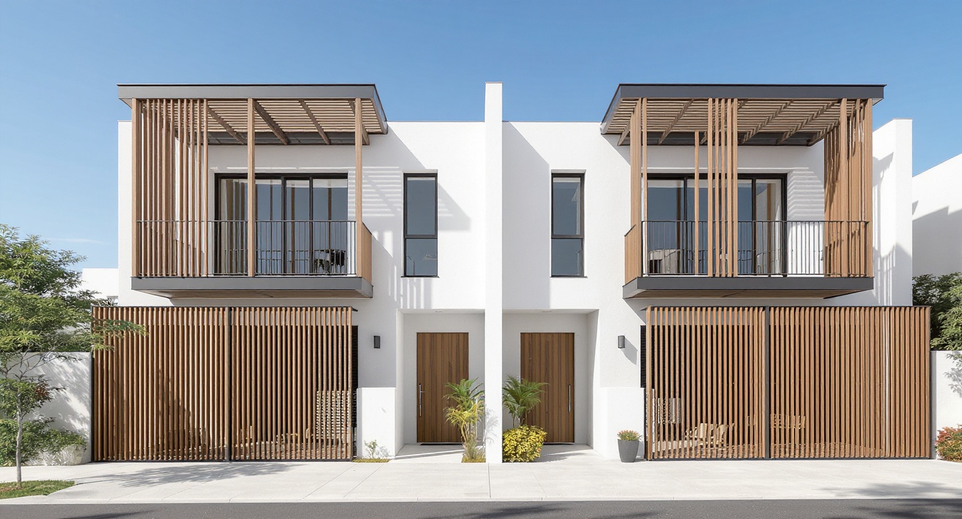 3d ai render of a modern twin townhouse facade featuring clean white plaster walls, vertical timber slat screens, and dark metal-framed windows. this photorealistic architectural visualization captures bright midday daylight, crisp shadows, and realistic material textures — highlighting the balanced symmetry, natural warmth, and contemporary design of the twin units.