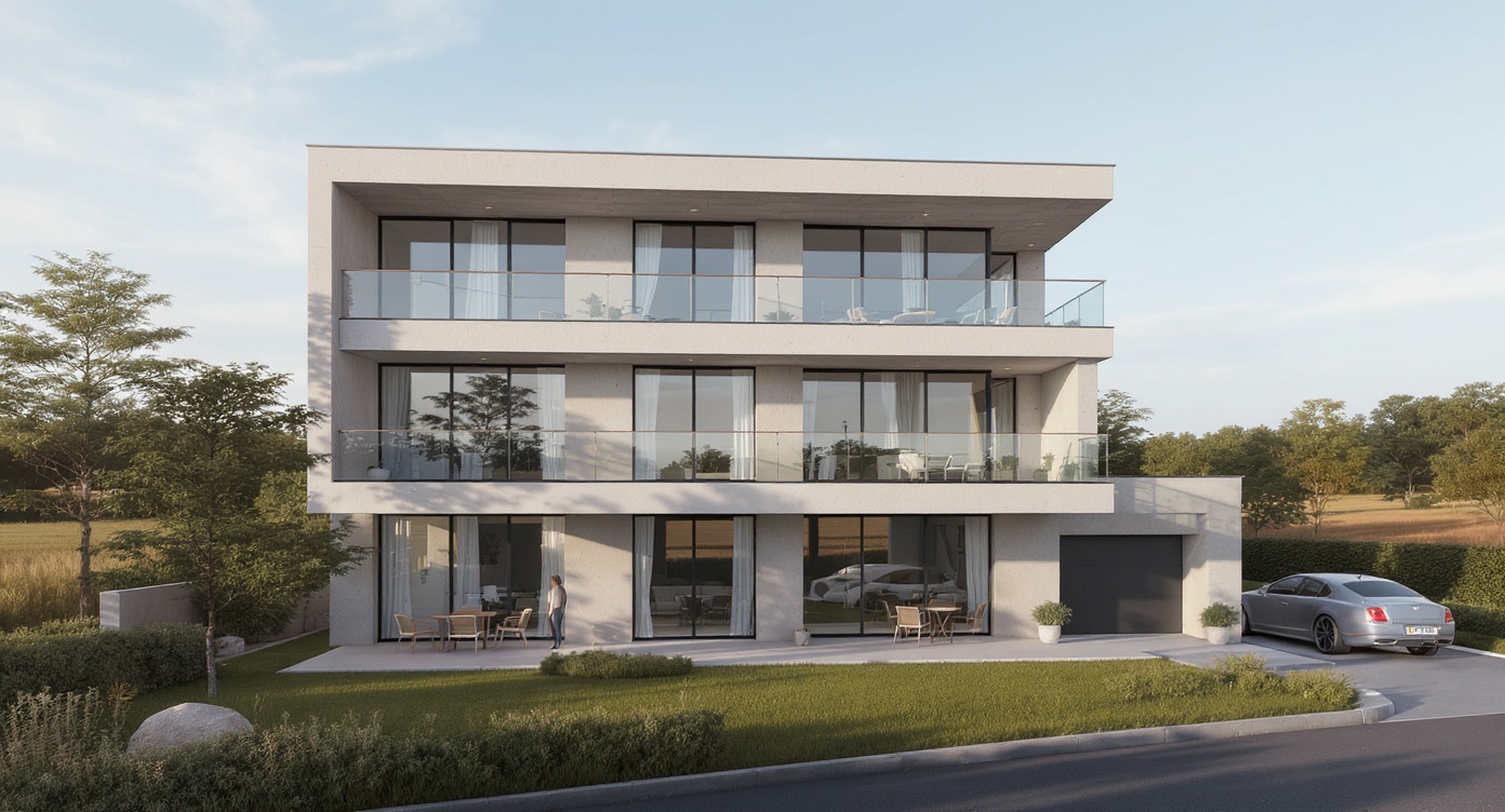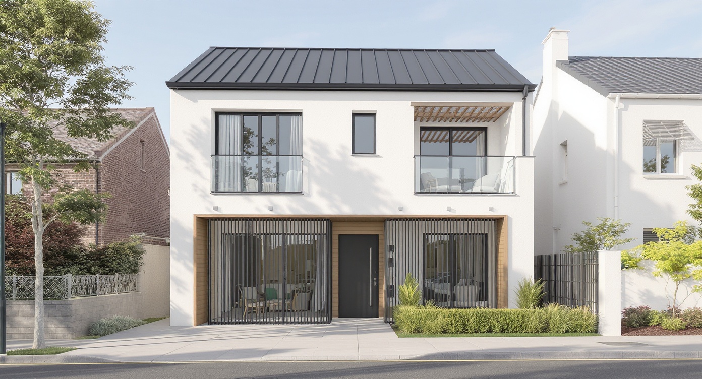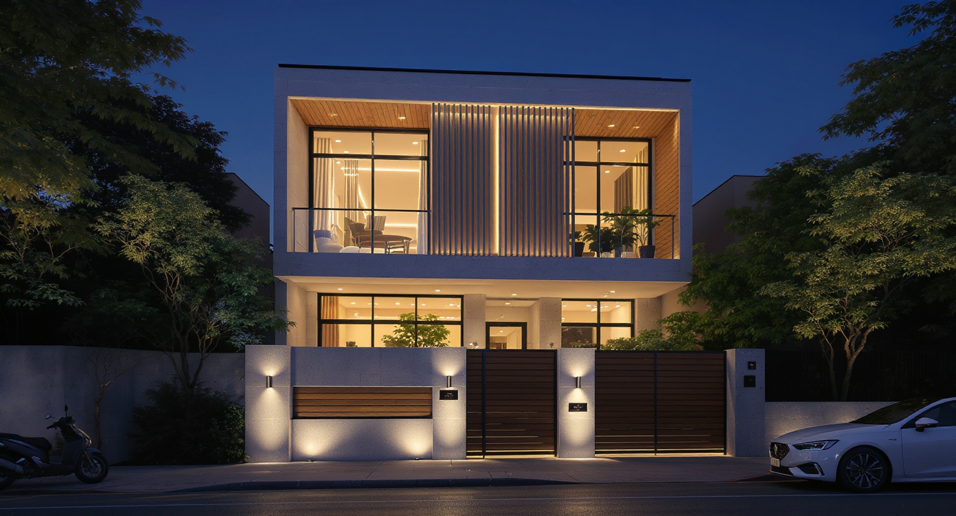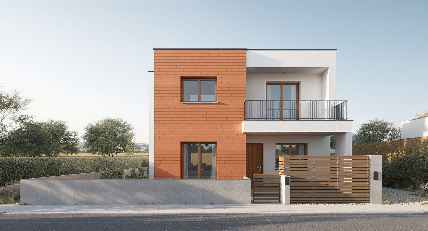 3d ai render of a modern twin townhouse facade featuring clean white plaster walls, vertical timber slat screens, and dark metal-framed windows. this photorealistic architectural visualization captures bright midday daylight, crisp shadows, and realistic material textures — highlighting the balanced symmetry, natural warmth, and contemporary design of the twin units.