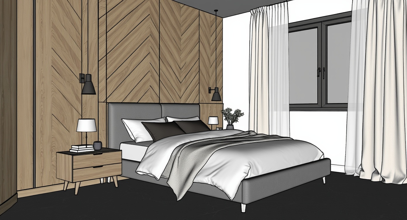 3d rendering interior design of a modern bedroom featuring a paneled headboard, built-in wardrobe, and refined neutral palette. this photorealistic visualization highlights dark polished granite flooring, soft morning daylight, and warm ambient lighting — creating balanced natural shadows, realistic material textures, and a calm, contemporary atmosphere ideal for architectural and interior visualization.