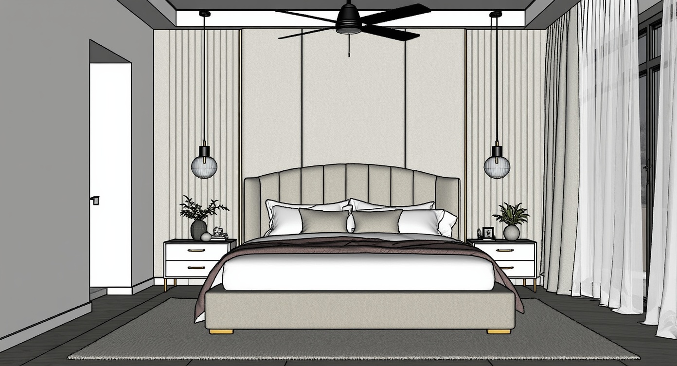 Sketchup rendering of a modern master bedroom featuring elegant wood paneling, a geometric upholstered headboard wall, and warm herringbone flooring. this photorealistic 3d visualization captures soft morning daylight, layered lighting, and refined neutral tones — creating a calm, sophisticated atmosphere ideal for interior design and architectural visualization.