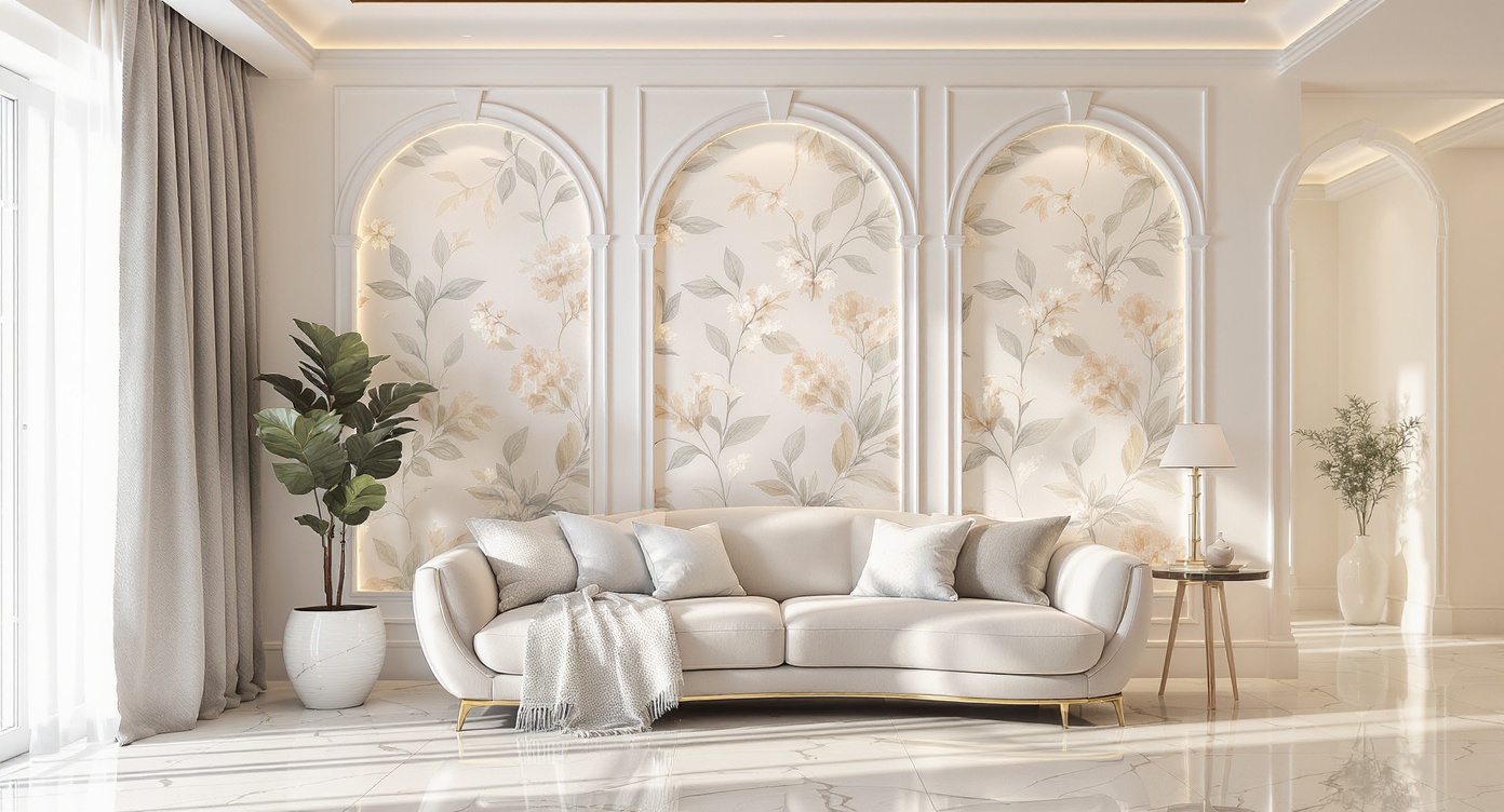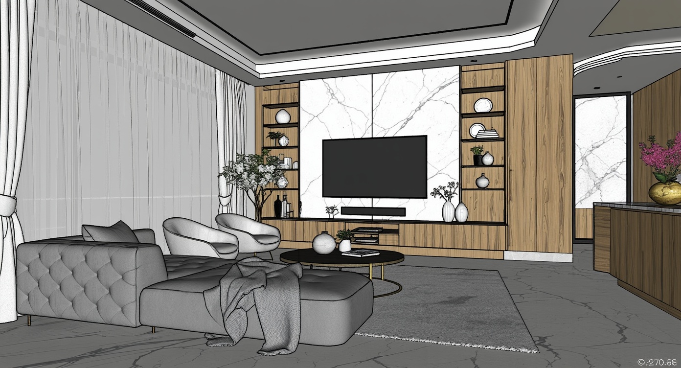 This high-resolution photorealistic living room 3d render depicts a modern interior with polished marble flooring featuring subtle grey veining that softly reflects morning daylight. the existing furniture layout is preserved — a tufted sofa on the left, two rounded upholstered lounge chairs near the window, an oval coffee table at the center, and an ottoman in the foreground — all facing a wood-accent media wall with a floating console and wall-mounted tv. full-height sheer curtains diffuse natural morning light, complemented by ambient interior fill and warm recessed cove lighting that highlights the layered tray ceiling. realistic materials include velvety upholstery, matte wood cabinetry, brushed metal accents, and high-polish marble with visible seams. soft shadows, natural window glare, and subtle specular highlights create a calm, neutral, photorealistic atmosphere.