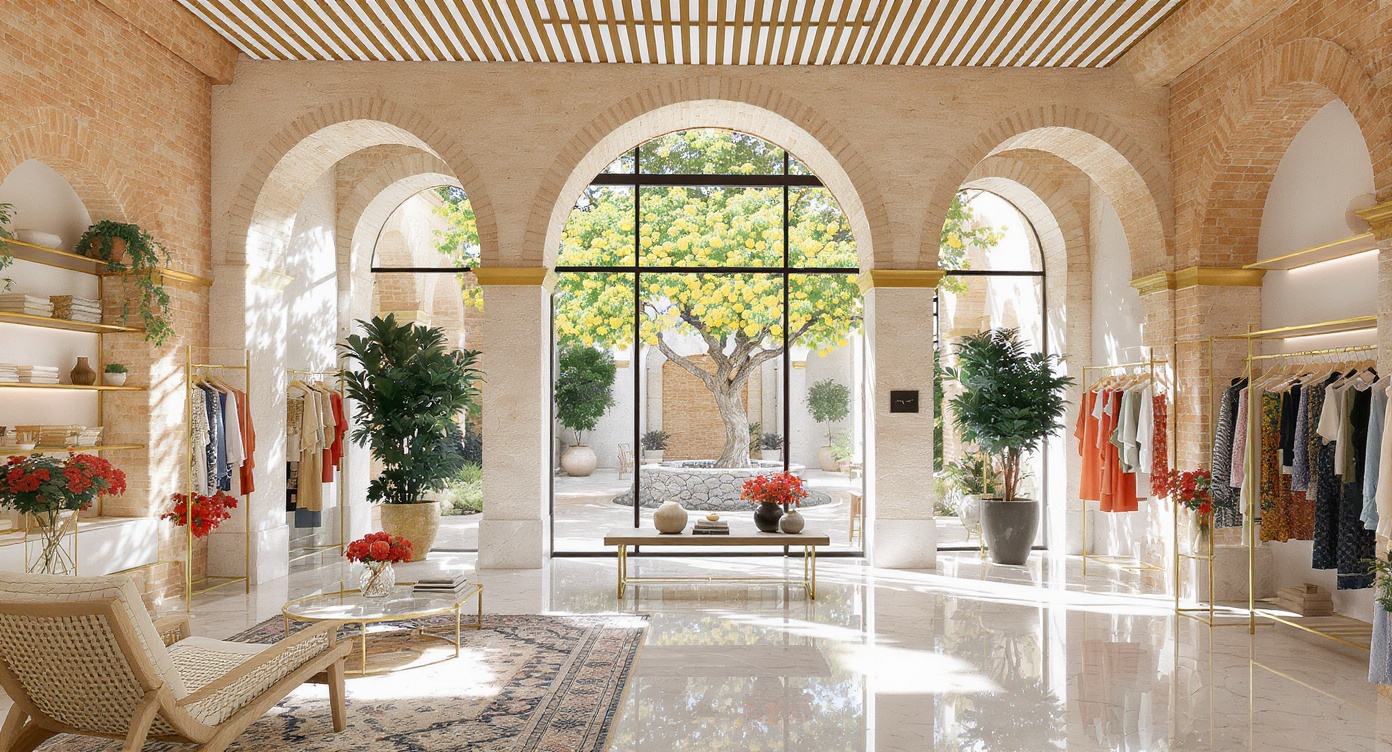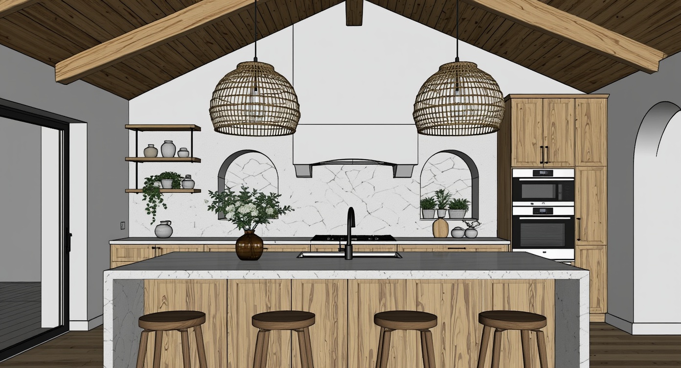 This high-resolution photorealistic kitchen interior design render depicts a modern rustic kitchen with a vaulted wood ceiling, a travertine-clad central island topped with a smooth stone countertop and a brown glass vase with white flowers, two wooden bar stools, and warm wood-accented lower cabinetry paired with built-in stainless steel double ovens set into textured plaster walls. three arched window niches above the sink hold small potted plants and a matte black faucet, while large woven rattan pendant lights hang over the island and natural wood slatted ceiling panels extend the warm palette. soft morning daylight fills the space with warm shadows and diffuse illumination, enhancing the wood plank flooring and photoreal materials—from visible wood grain and woven rattan texture to subtle stone veining—and a subtle lived-in backplate visible through the arches adds depth.
