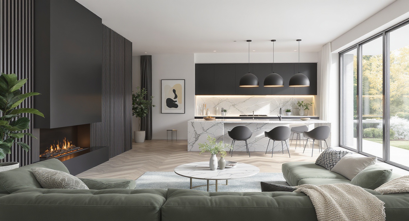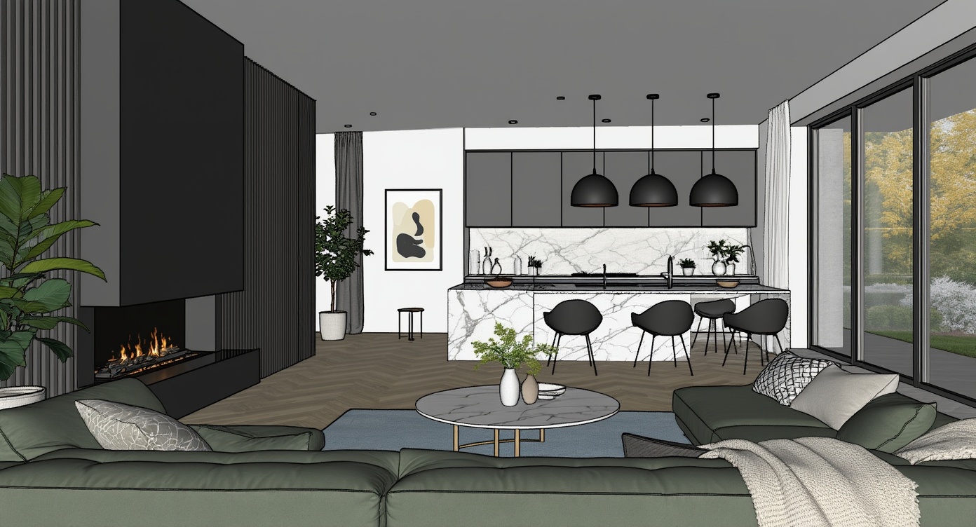 A high resolution photorealistic 3d render of a modern dining room with open-plan kitchen, dark wood accents, marble island, and large windows