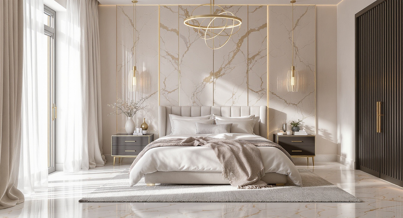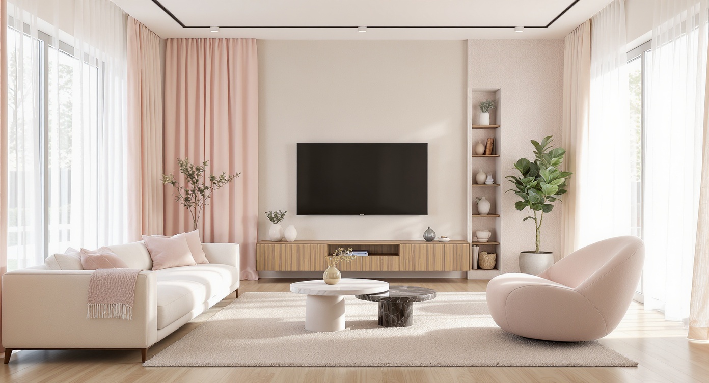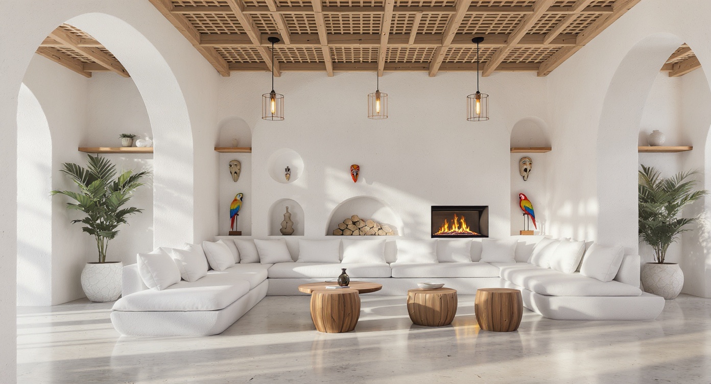 3d rendering of modern living room in a mediterranean-inspired style featuring textured stone accents, built-in seating, and a warm wood lattice ceiling. this photorealistic visualization captures soft morning daylight through sheer curtains, subtle warm interior accent lighting, polished concrete flooring with a gentle sheen, and refined natural materials — creating a bright, airy, and inviting atmosphere ideal for high-end interior design presentation.